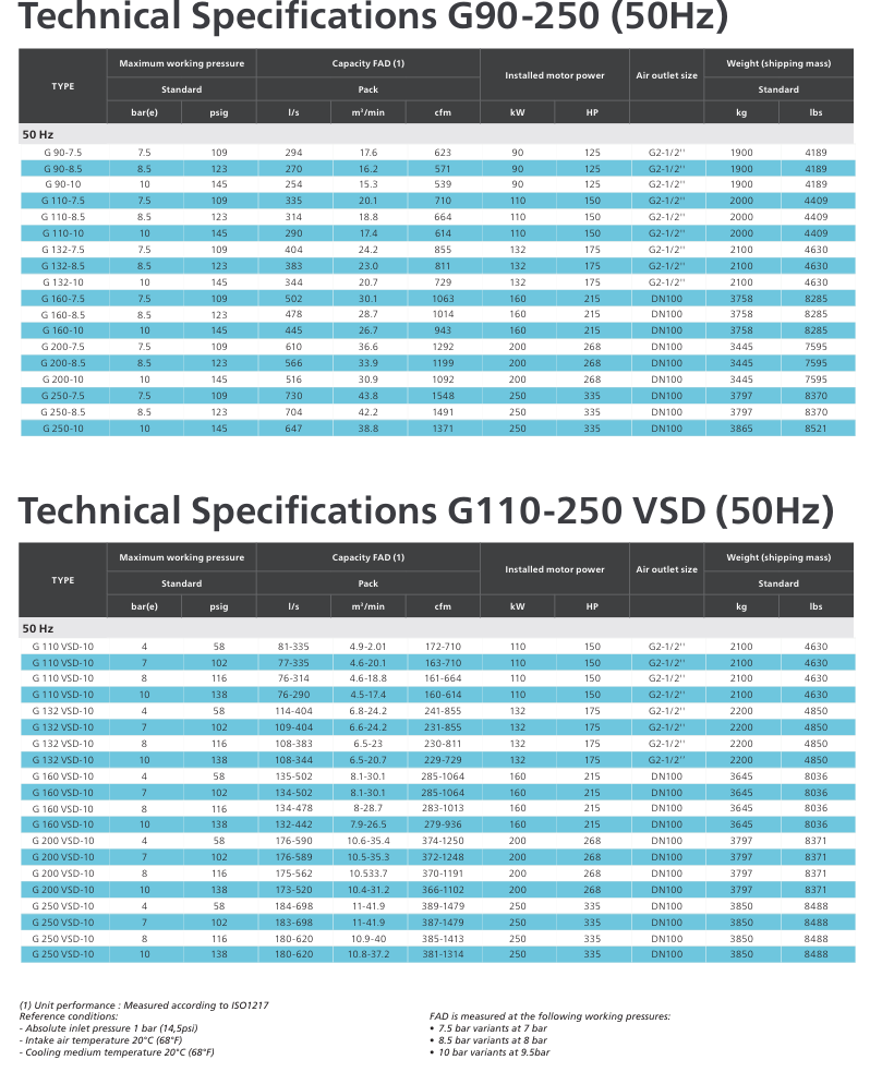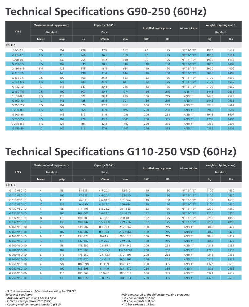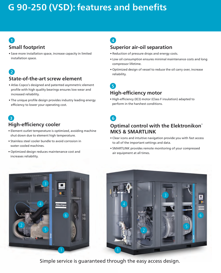 Atlas Copco Oil-injected rotary screw compressors G90-250 (VSD) 125 -355 HP